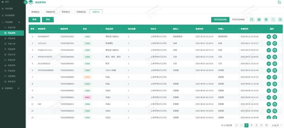 申辦方寄藥后,機(jī)構(gòu)中心實時查看寄送信息,自動生成驗收單,藥品到達(dá)時簡單錄入完成驗收。