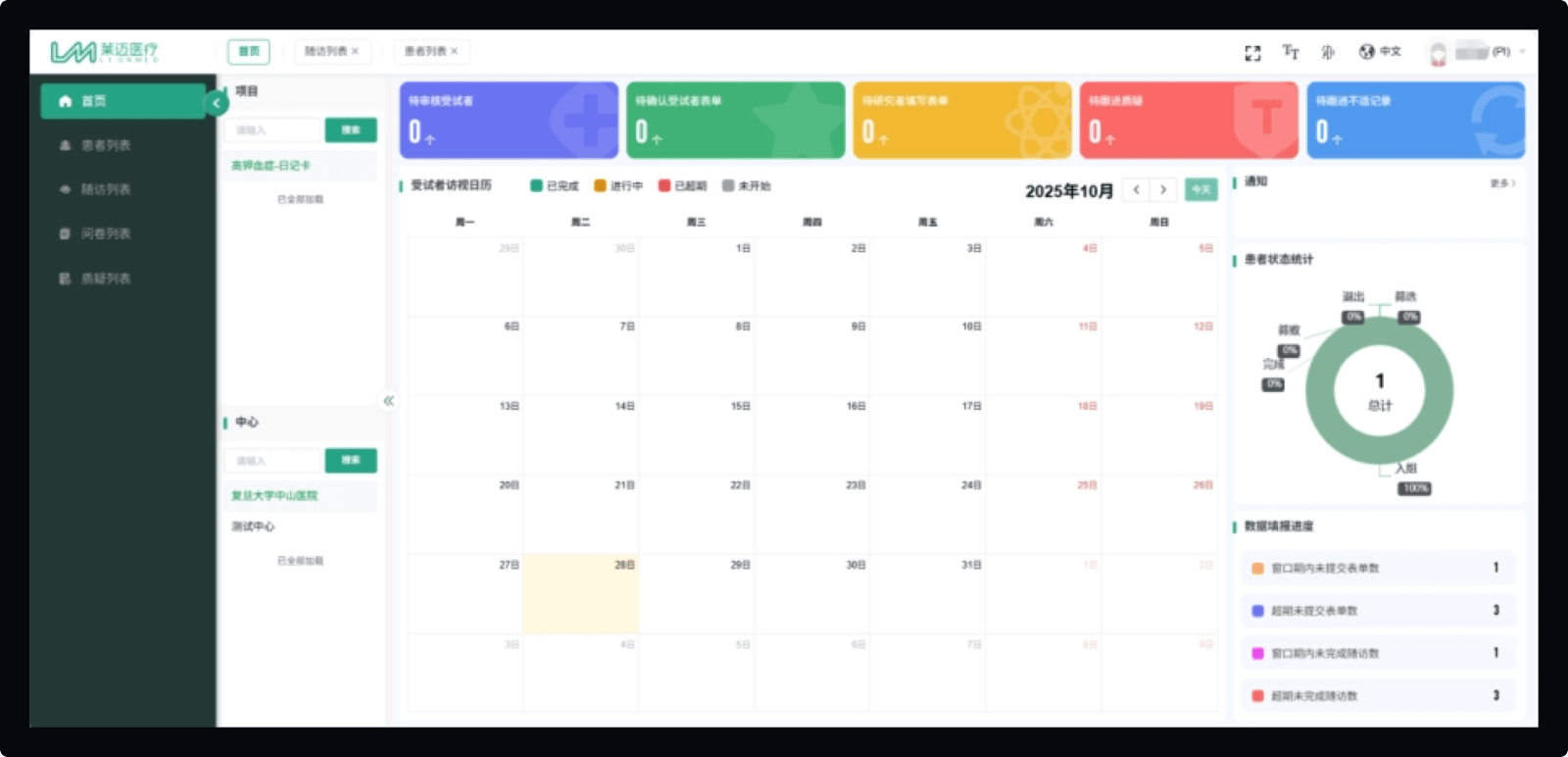以患者管理為核心、支持多項目協(xié)同運營的智能化臨床研究管理平臺。基于臨床研究中的場景需求及項目管理與運營過程中的痛點,實現(xiàn)患者知情、患者管理、患者隨訪、項目管理等場景功能深度整合;基于功能模塊化的開發(fā)設(shè)計,可針對不同臨床研究項目的特點為患者管理和項目管理提供個性化支持。
