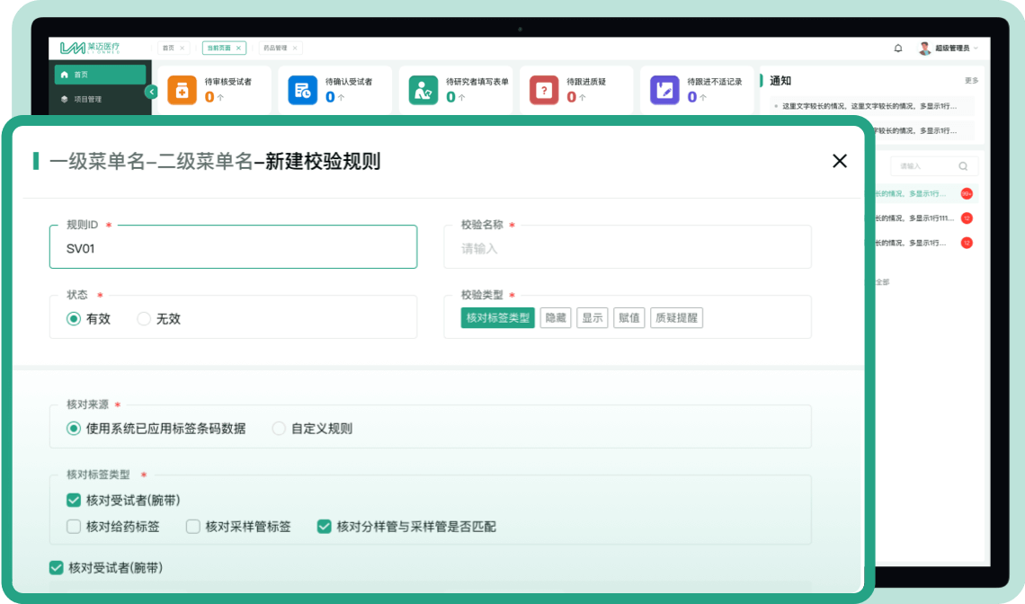 支持受試者腕帶、樣本、藥品標簽的設(shè)計和打印,并在數(shù)據(jù)采集過程中核驗受試者身份、藥品標簽、樣本標簽。